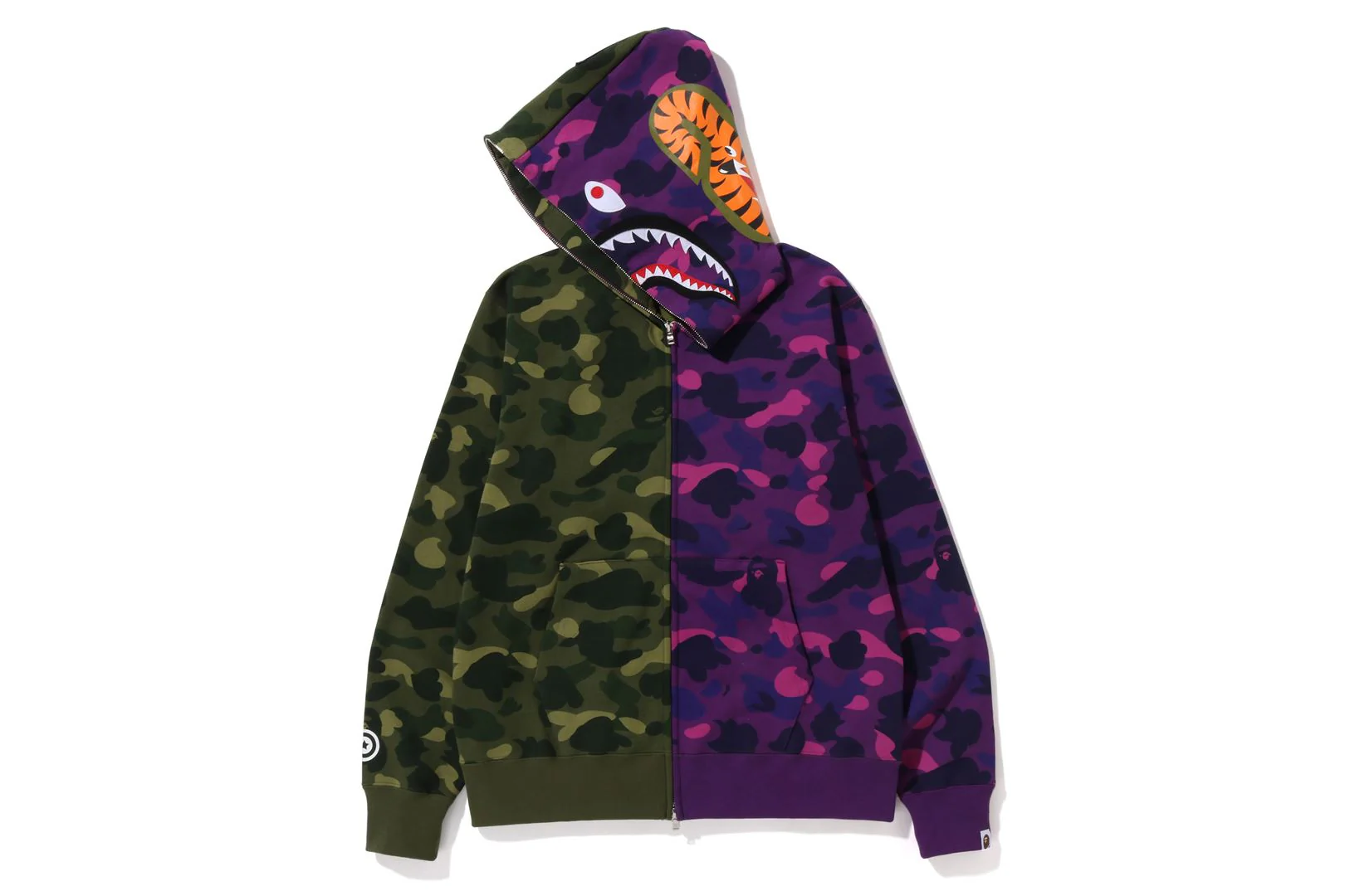 Zip-up hooded made of cotton fleece material. on the front of the hoodSHARKDesigned with a patterned felt patch, a WGM pattern Sagara patch on the right back of the hood, a TIGER pattern graphic on the left back of the hood, and a star circle graphic on the right sleeve. COLOR on the left and right sides of the body CAMOSpecifications arranged in bicolor. A muff pocket is placed on the abdomen of the front body, and a piss name is placed on the left sleeve. Regular fit silhouette. Available in 2 colors and 6 sizes.
