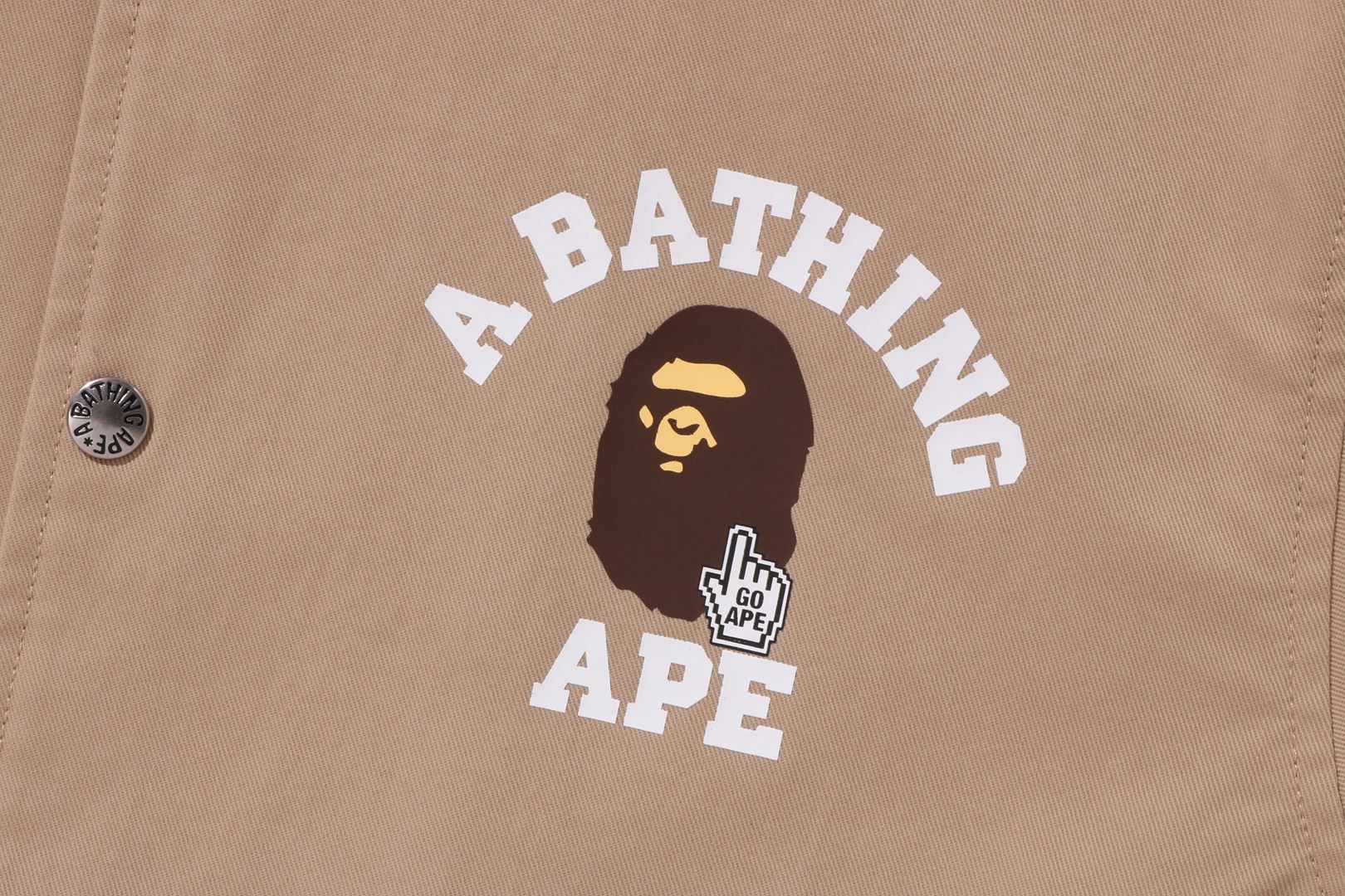 WEB STORELimited line ONLINE EXCLUSIVE. Coach jacket made of cotton material. Rubber print COLLEGE logo on left chest. Under the back collarAPE HEADand “Welcome to BAPE® world!'' rubber print. Slash pockets on both hips of the body, piss name in the center of the hem, snap buttons on the front, and rubber ribbed cuffs. A silhouette with a roomy width. Item limited to Japan.