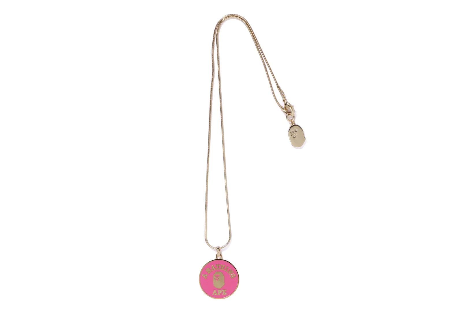 A chain necklace with a COLLEGE logo pendant top made of epoxy resin. to the clasp partAPE HEADDesign with charm included.