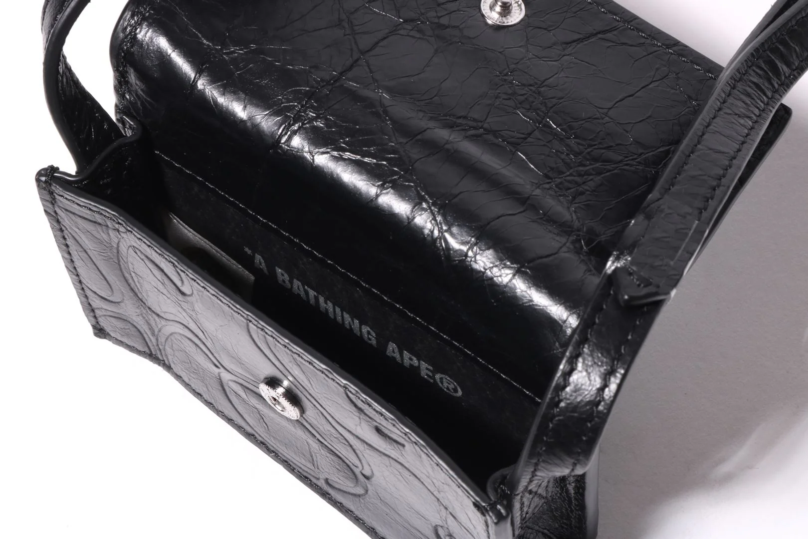 Reservation CAMOA mini wallet with shoulder strap made of cow leather with an embossed pattern. Silver-tone brand logo plate on the front flap. The strap is adjustable.